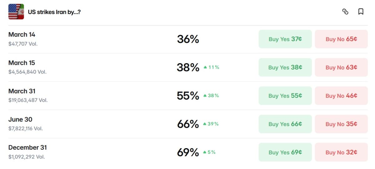 Тем не менее американцы вряд ли атакуют исламскую республику в ближайшее время. Об этом говорит тот факт, что вероятность нападения США на Иран до 15 марта оценивается в 38% на рынке прогнозов Polymarket. По данным редакции Happy Coin News, шанс начала военного противостояния до конца года достигает 69%.