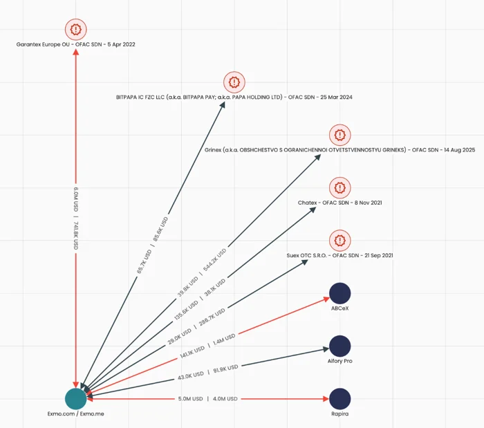 Анализ Elliptic показывает, что обе компании используют общую инфраструктуру хранения средств и объединённые горячие кошельки. Через Exmo прошли более $19,5 млн в криптовалютах, а конечными пунктами были кошельки Garantex, Grinex и Chatex.