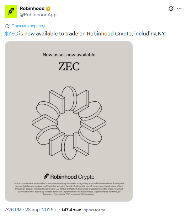- Добавление в торговое приложение Robinhood положительно сказалось на цене конфиденциальной криптовалюты Zcash (ZEC).