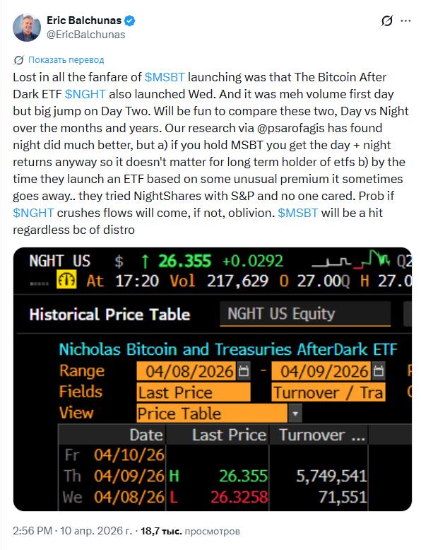 Балчунас отметил относительно скромный объём торгов в первый день и последующий рост на второй, добавив, что успех NGHT будет зависеть от устойчивого превосходства, а не от структурной новизны.